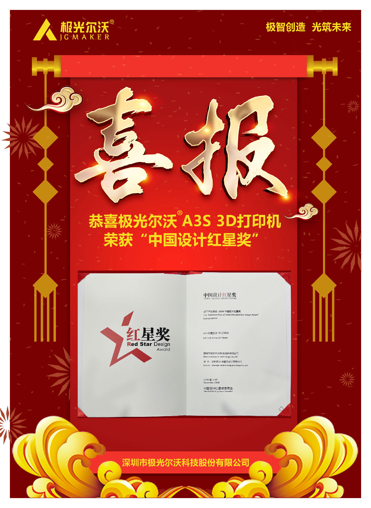 12月9日,2020中國設(shè)計紅星獎頒獎活動在北京舉行。2020年中國設(shè)計紅星獎以"融合的時代 凝聚的力量"為主題,來自全球5000家企業(yè)的7000余件產(chǎn)品參與角逐極光爾沃A3S 3D打印機憑借新穎獨特的設(shè)計理念、簡潔純粹的產(chǎn)品形象從眾多產(chǎn)品中脫穎而出,獲得評委一致青睞,一舉拿下2020中國設(shè)計紅星獎。