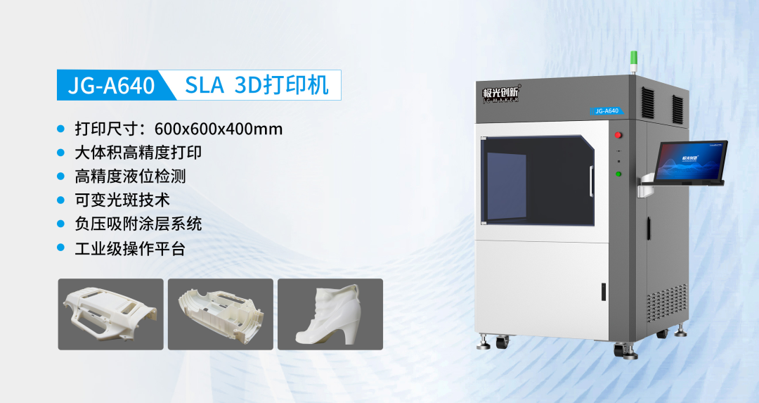 在展位上宣傳展示的一系列產(chǎn)品中,極光創(chuàng)新王牌級(jí)產(chǎn)品JG-A640工業(yè)級(jí)光固化3D打印機(jī)當(dāng)仁不讓占領(lǐng)C位,JG-A640依據(jù)其大體積、高精度、低成本的特點(diǎn),更大限度的提高了生產(chǎn)率和靈活度,高達(dá)0.05m的精度等級(jí),可制作各種結(jié)構(gòu)復(fù)雜的精密零件和組裝件