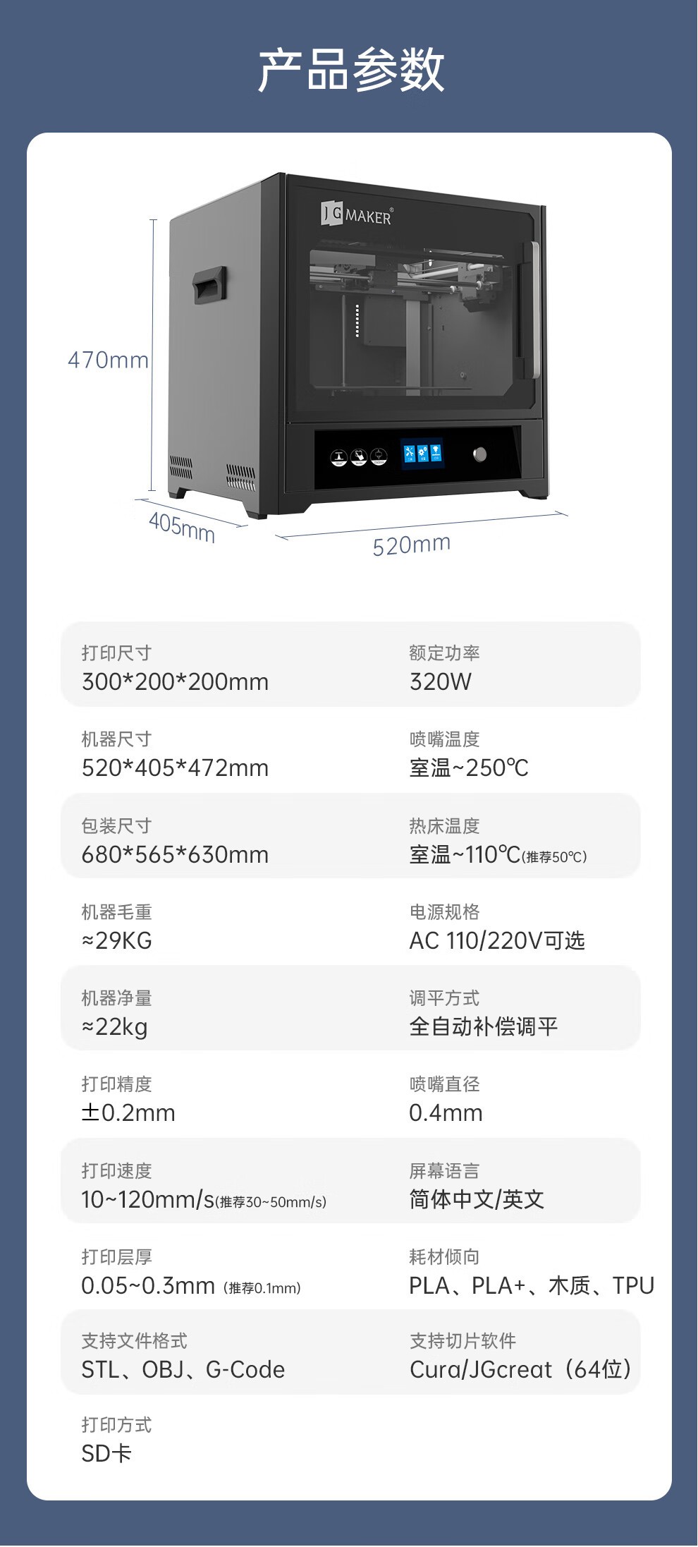 支持文件格式:STL, OBJ、 G-Code機(jī)器尺寸:520*405*472mm