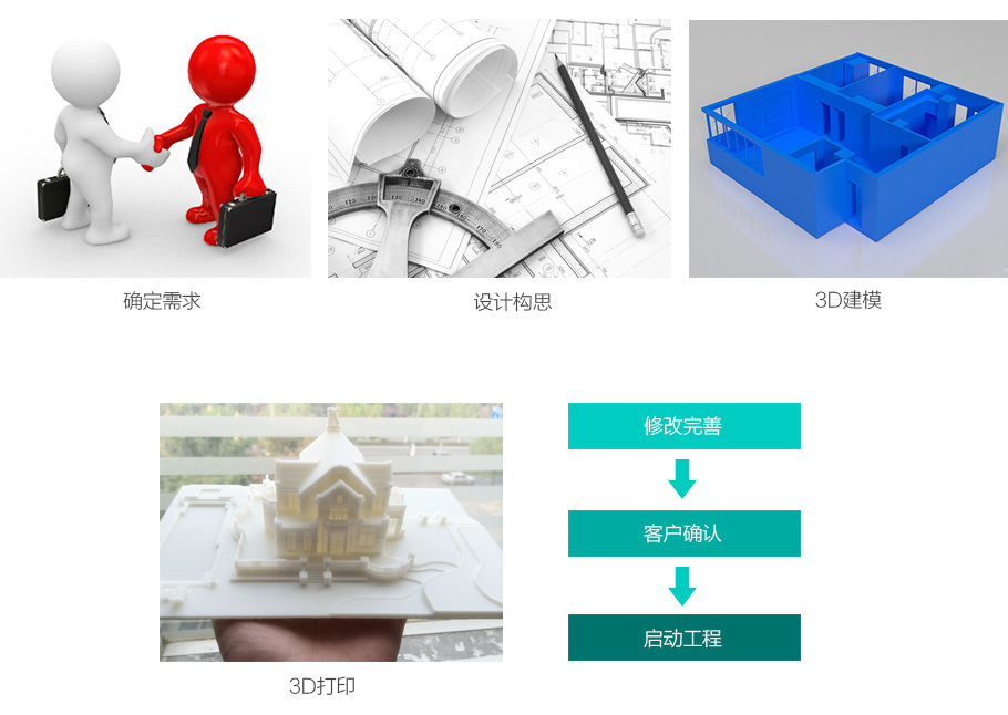 了解客戶需求→構(gòu)思設(shè)計(jì)→3D建?!?D打印出來(lái)→修改完善→客戶確認(rèn)→啟動(dòng)工程。