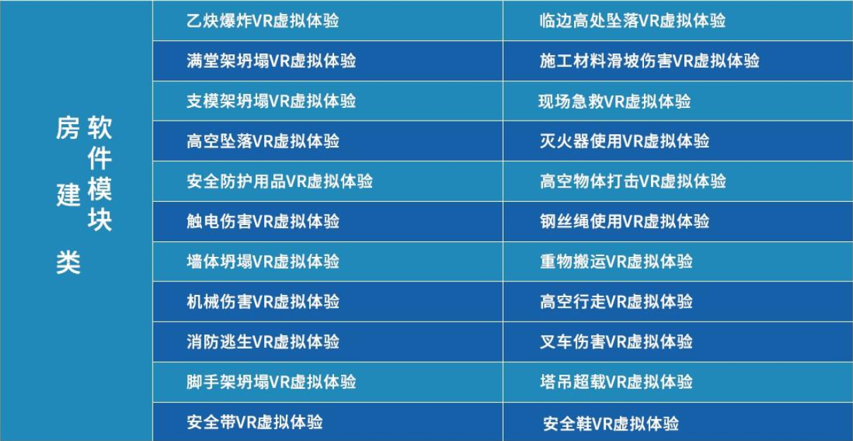VR安全體驗(yàn)館的體驗(yàn)項(xiàng)目包括了房建、地鐵、路橋等多個(gè)模塊的內(nèi)容,具體如下: