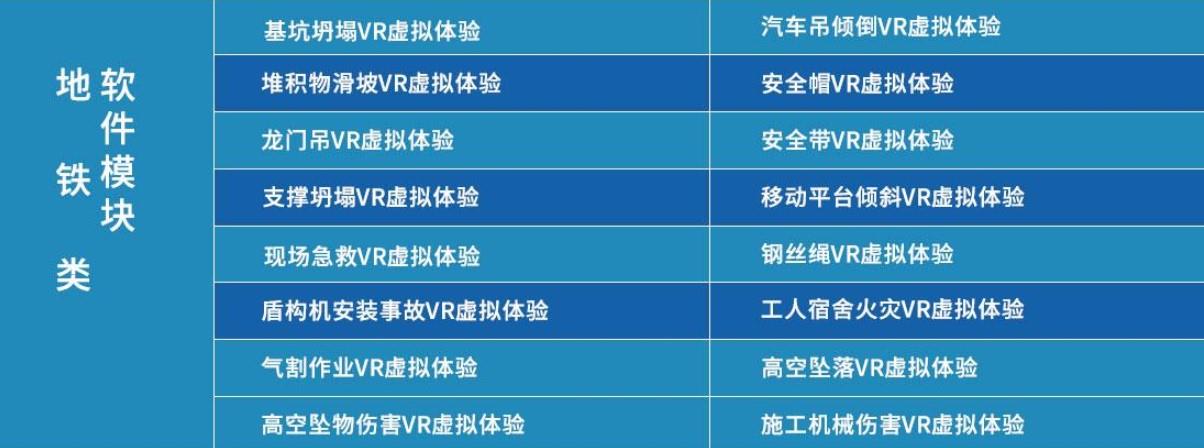 地鐵類軟件模塊主要有施工機(jī)械傷害VR體驗(yàn)、氣割傷害VR體驗(yàn)、安全帽撞擊、宿舍火災(zāi)、高空墜物傷害、基坑支撐坍塌、基坑坍塌、現(xiàn)場急救、安全帶使用、汽車吊側(cè)翻、移動(dòng)平臺傾倒、安全用電觸電、高空墜落等多個(gè)VR體驗(yàn)項(xiàng)目。