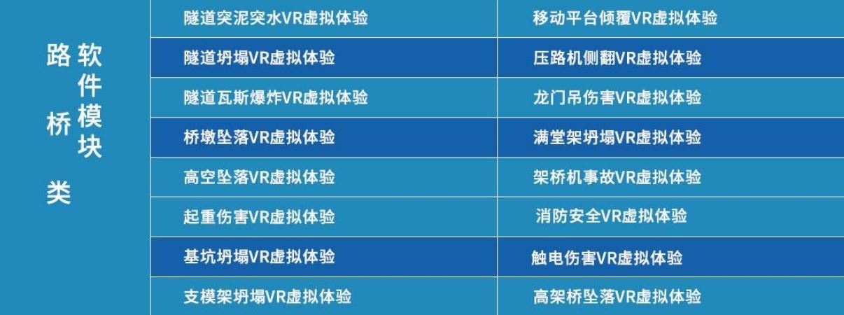 路橋施工軟件模塊主要有支模架坍塌VR體驗(yàn)、消防安全VR體驗(yàn)、隧道瓦斯爆炸、隧道突泥突水、觸電傷害、高空墜落、高空作業(yè)、基坑坍塌、起重傷害、隧道坍塌逃生等多個(gè)VR體驗(yàn)項(xiàng)目。